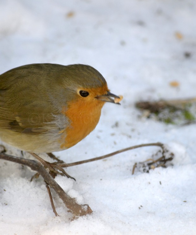 Photo d’un rouge gorge avec une graine dans le bec dans la neige pour le thème « Voler » pour le projet 52 sur vivre la photo sur le blog de photo et de cuisine bio de ©Kaderick en Kuizinn